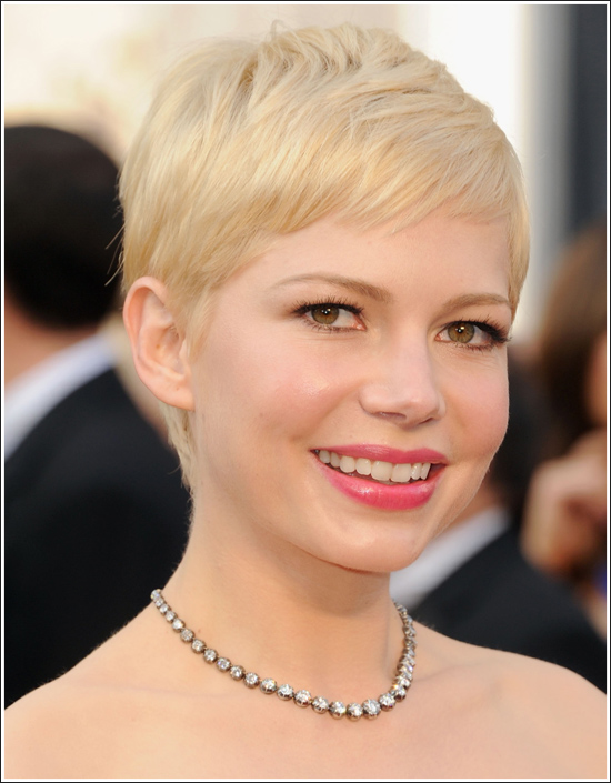 A atriz Michelle Williams estava toda linda em um Louis Vuitton de tom coral. Modelo tomara-que-caia e "saiote" na linha da cintura. Na maquiagem, olhos levemente esfumados e boca rosa com gloss